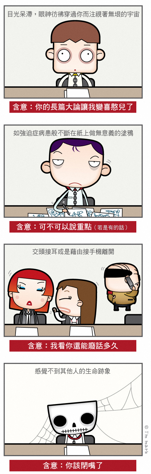 所以當會議已經超過了這個臨界點,而你的長篇大論還沒結束時,你就會發現大家因為漸漸喪失意志力而表現出的舉動,演說者應該藉由解讀這些肢體語言而適度調整你的發言內容,好讓大家不至於太討厭你。ps.老闆與機車主管除外,反正也沒人喜歡你,你愛講多久就講多久啦!