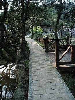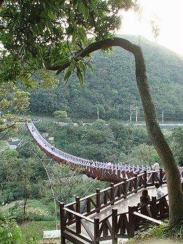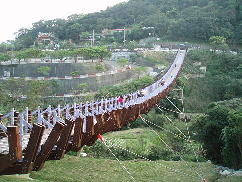 白石湖吊橋,對面為碧山巖停車場及開漳聖王廟山門。