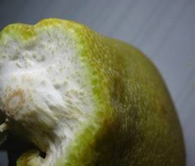 1 將柚子洗淨,將蒂頭切除,可以看見除了中間的果內外,柚皮有最外層綠色部份及內裡厚厚的白色部份。