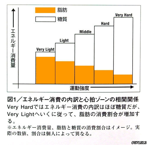 來看看這一張圖(轉載自 funride雜誌),可以看出醣跟脂肪消耗的比例。圖中,分為五個階段,是以最大心跳數(MHR)為基準區分出來的,最大心跳數的算法是(220-年齡),然後分成Very Light-(60%以下心跳)、Light-(60%-70%心跳)、Middle-(70%-80%心跳)、Hard-(80%-90%心跳)、 VeryHard-(90%以上心跳)..等不同程度來看...