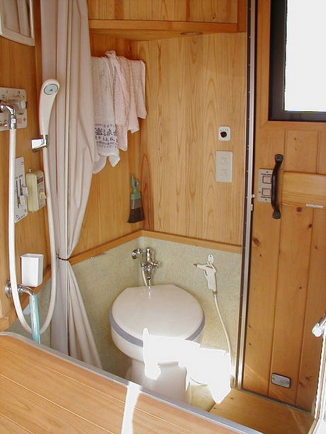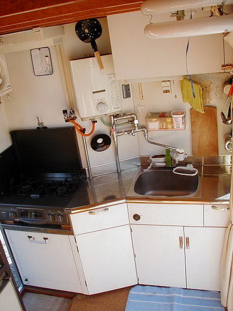 哪來那麼多空間可以做成這麼多款的置物櫃勒?有注意到電話、電鍋、電扇…這些都有耶~感覺就像是小坪數的住家一樣。這台「流動房子」還有二樓,上圖就是前往二樓的通道。