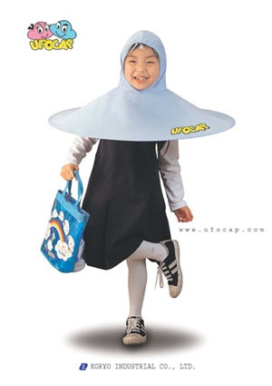 這是來自韓國的設計得獎作品,已取得專利開始生產販售,專為孩童設計的【UFO雨傘帽】。下雨天時,小朋友只要套著這個傘帽,不需撐傘、不需穿雨衣,因為兩者已合而為一了!