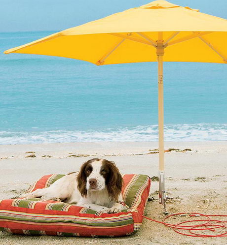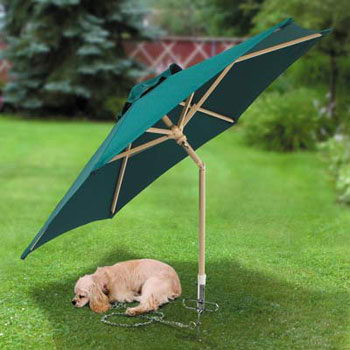 下雨有雨傘,那出大太陽時有沒有洋傘可撐啊?嘿嘿~真的就是有!也有出這種專門給狗狗作日光浴用的大洋傘,下圖這個還可依照太陽光的方向轉變,進行不同角度的調整。