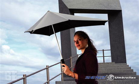 夷~這個小姐怎麼撐了把歪傘出門啊?!不是喔!這把歪傘來頭可不小,曾於2007年在國際間獲獎無數的抵抗強風傘「 SENZ Umbrellas 」!這是由荷蘭設計製造、經過100km/h的風速測試,也不會開傘花的強風傘。