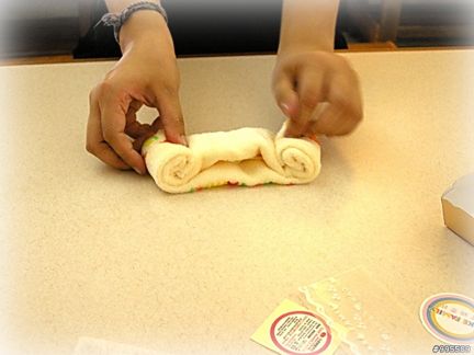 仔細的捏出扇子狀的縐摺,再用標籤鐵絲固定好,漂亮可愛的水果優格蛋糕毛巾就完成了。簡單吧!