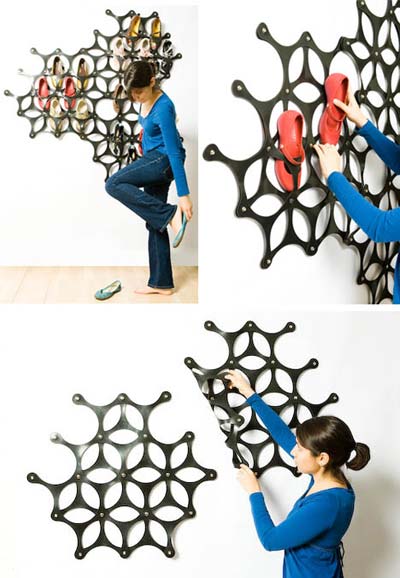這是一款構思非常新穎的鞋架。它採用彈性材料製成,可以直接被掛在牆上,而且大小也可以根據需要隨意組合。不過,用這樣的鞋架來放鞋,可一定得事先考慮好牆壁耐髒的問題哦。