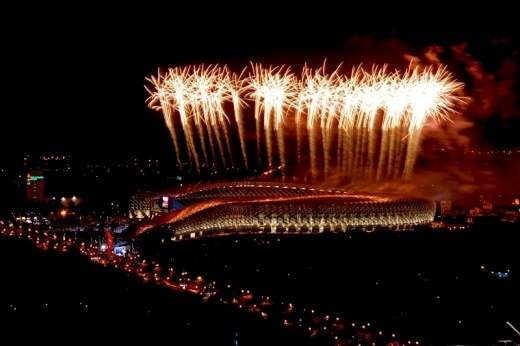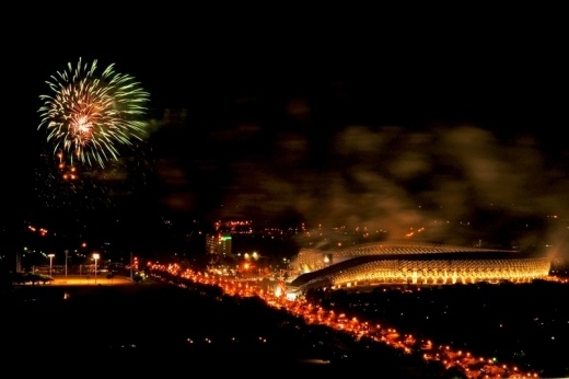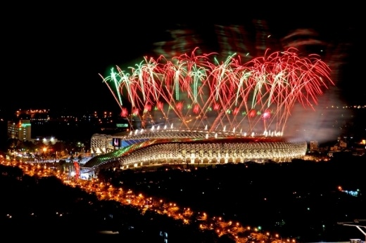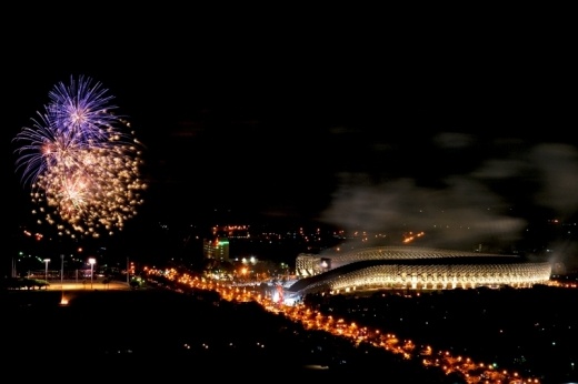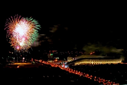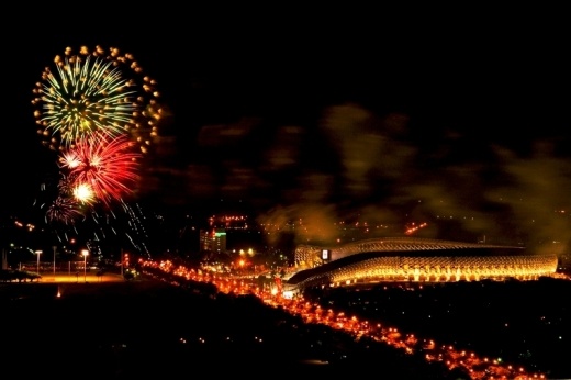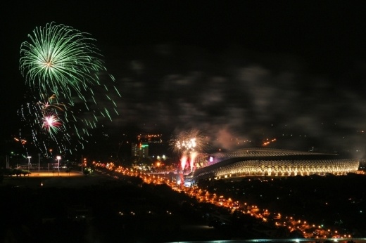 沒放幾幕就停止主場館上的煙火秀,停了許久(約一個多小時),忽然在主場館馬蹄口的正前方廣場冒出火花,害大家又急急忙忙的重新構圖。