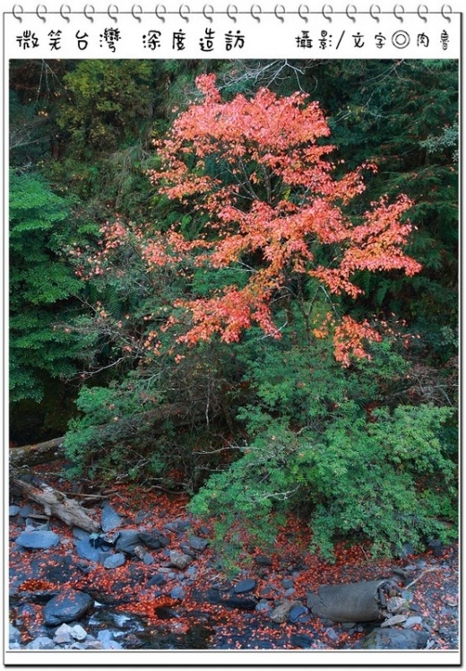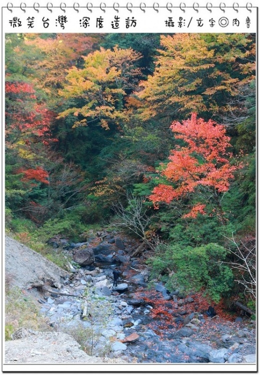 ▲本來想下去拍攝溪谷落楓的景象,但是由於下到溪谷的路太過於崎嶇,安全考量下就在上方拍攝,看到下方正有兩個大師在拍攝嗎?冬的氣息早已蔓延,但秋的味道卻飄散在中橫楓之谷內,落葉飄落在溪流上,浪漫異常,造訪者無不驚呼:好美好美!