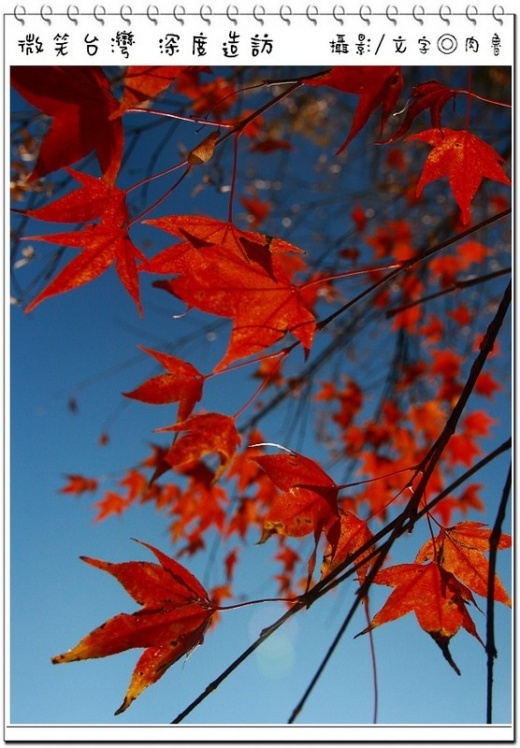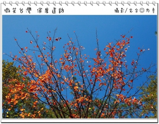 ▲一路的蜿蜒在中橫公路上,為了抵達福壽山真的需要一股毅力與體力,我們先到了梨山稍做休憩,想不到梨山遊客中心旁有一顆楓樹火紅的好漂亮,加上藍天為背景,水啦!