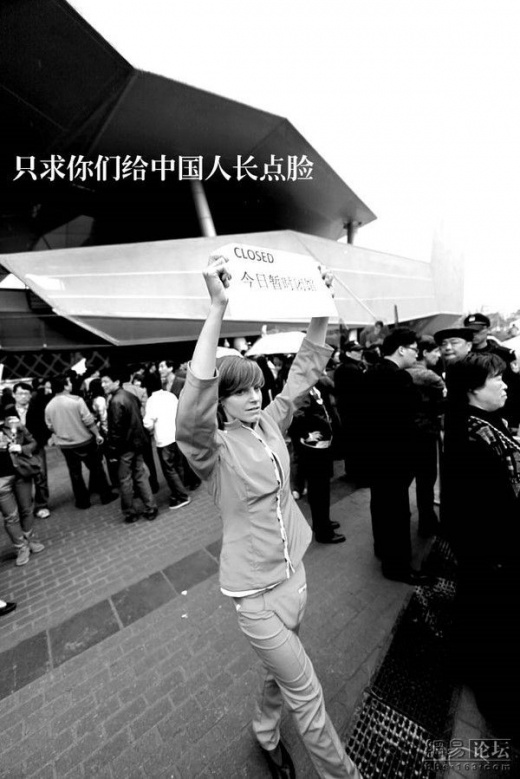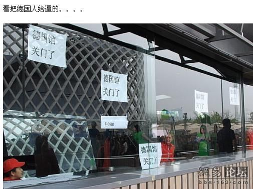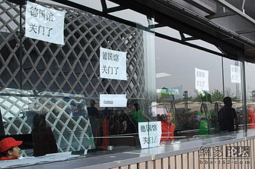 今天許多館還沒開放,在開放的館外面於是排起了長長的隊伍。由於隊伍過長,都是之字型隊伍迂迴蜿蜒,這又給了很多人插隊的好機會。據我觀察,多數還是那些四五十歲年紀的男女。只要一個人插隊,其他人就不甘其後,彷彿自己不插隊就吃了虧一樣,一哄而上,而且對後面的人指責充耳不聞,有些還及其凶悍的反擊,於是各館外推搡吵架輪流上演。意大利館的玻璃被砸碎。各國館的工作人員都是各國的老外,老外哪裡見過這等架勢,被弄得很抓狂,於是德國館關門了,英國館關門了,澳大利亞館關門了。。。