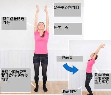 雙腳分開與肩同寬, 雙手儘量向上伸展,臉向上看,背儘量向後彎曲伸展。集中精神進行腹式呼吸:「吸氣、吐氣」15秒x2次。