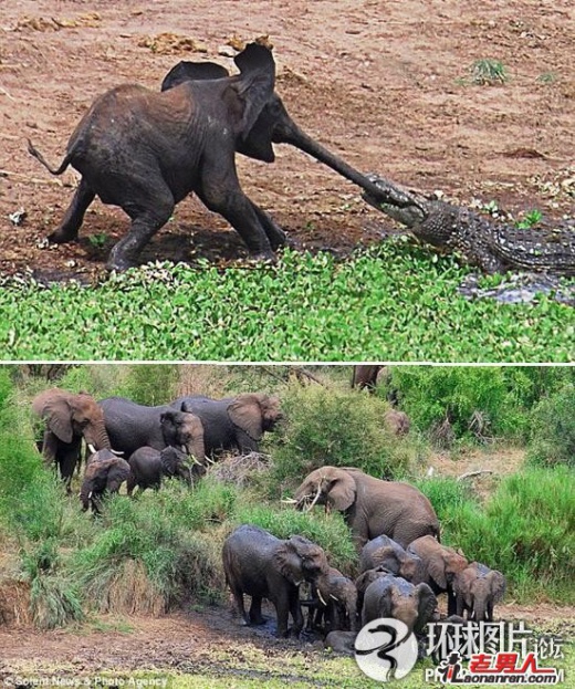 業余攝影師約翰·奧珀曼2010年10月在南非克魯格國家公園拍攝了一段令人詫異的場景。照片中,一頭小象在象群的注視下走向水坑飲水,不幸的是,這里還埋伏著一條饑餓難耐的鱷魚。它突然從水中躍起并死死咬住小象的長鼻。一旁的象群紛紛趕來施救。在象群地動山搖的聲勢面前,鱷魚不得不選擇放棄,躲進了水塘中。