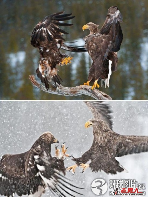 三只白頭鷹為了爭奪食物,在空中展開肉搏戰,結果糾纏一起,爪子彼此相扣,墜向地面,似乎想看看誰能堅持到最后。這一幕剛好被一名業余野生動物攝影師拍到。