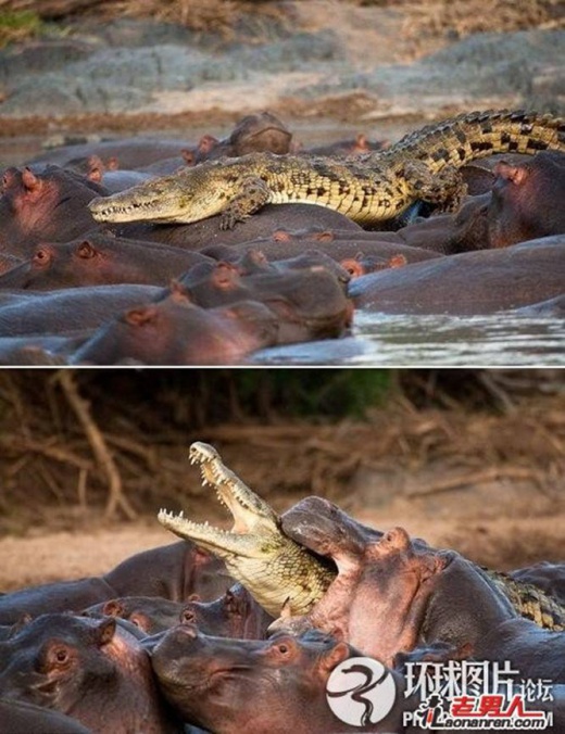 鱷魚那能嚼碎骨頭的嘴巴、24顆極鋒利的牙齒和裝甲般的皮膚足以讓多數動物敬而遠之。但即便這樣鱷魚也無法與一群憤怒的河馬抗衡。這個象爬蟲一樣的食肉動物試圖抄近路--從河馬媽媽及她的孩子們身上走過去,誘捕小河馬,結果卻遭遇滅頂之災。事實證明河馬的咬力與鱷魚的咬力一樣具有致命性。