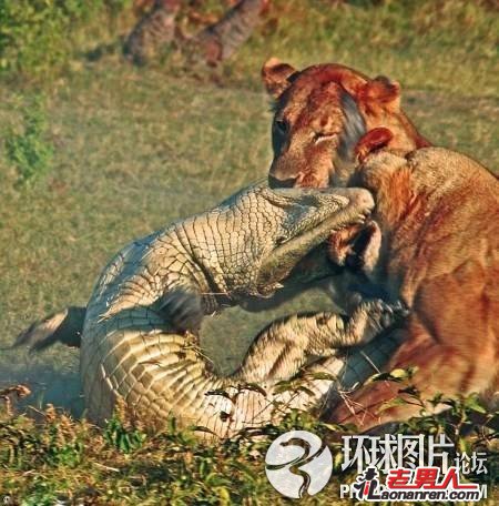 三頭母獅為保護幼崽合力咬死鱷魚 南非58歲的心臟病學家托尼·戈德曼于2011年1月在博茨瓦納旅行時拍攝到了一組令人震撼的照片,反映的是三頭母獅圍攻一只鱷魚并最終將其殺死的情景。