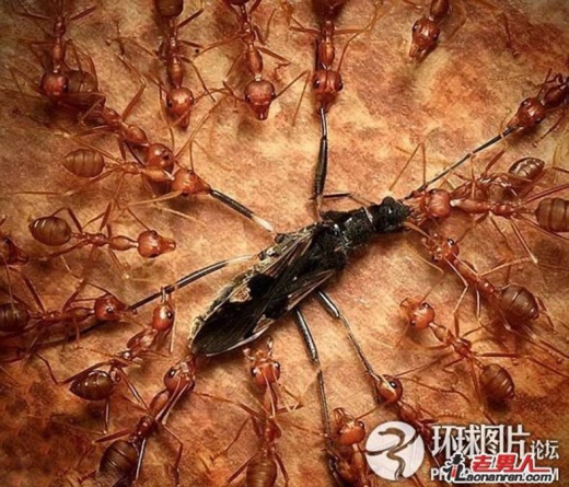微距攝影展現蟻群圍攻不速之客瞬間 螞蟻像人類一樣,也對擅闖家園的不速之客向來不歡迎。所以,當一只蒼蠅落在它們中間時,這些螞蟻立即圍上去展開攻擊。從天而降的蒼蠅雖然體型至少是螞蟻的兩倍,但在與團隊力量的對決中毫無取勝之機。這是印度尼西亞業余攝影愛好者安迪亞恩·魯特菲拍攝的一組微距照片中展現的畫面之一。