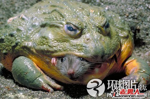 非洲兇殘巨型牛蛙吞食活老鼠 2010年11月,攝影師拍攝到一張非洲巨型牛蛙的照片,當時這只渾身長滿類似粉刺,皮膚褶皺的青蛙正對著鏡頭洋洋得意享受它的美食,完全不顧它嘴里的老鼠還拼命掙扎著求生。