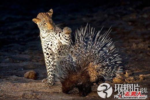 動物大戰:非洲豹大戰多刺豬 在博茨瓦納馬沙圖禁獵區,一頭兩歲大的雄性非洲豹發現了一頭多刺的豪豬。幼豹試圖從上方撲向豪豬,并將它推翻在地,但一切卻是徒勞。每當交戰時,豪豬就會猛烈搖動身上的硬刺,致使幼豹絲毫找不到下手之處。在雙方僵持25分鐘后,玩性十足的豹子的前爪顯然是被尖刺刺痛了,只好夾著尾巴灰溜溜地走開。