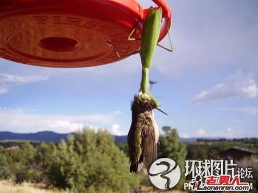 攝影師拍下螳螂倒掛吞食蜂雀場景 當地時間 2009年9月25日 ,美國,一只倒掛在空中的螳螂叼住一只蜂雀的頭正吃得開心。你敢相信看到的這一切嗎?天知道小小的螳螂怎么叼得住這只蜂雀,它可比起碼比蟲子重十幾倍。