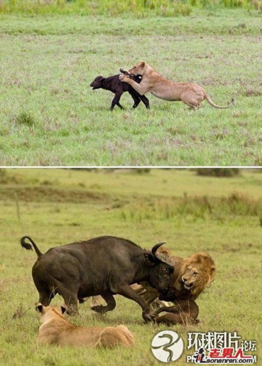 非洲野牛為救孩子與獅子大戰搏斗達15分鐘 2009年1月18日 ,在南非博茨瓦納,攝影師Lee Whittam拍到獅子和非洲野牛大戰的精彩場面。當時,一頭獅子撲到了一頭非洲小野牛,正當它準備開始享用美餐時,小野牛的母親突然沖向獅子去解救它的孩子,在經過大約15分鐘的搏斗后,小野牛最終還是不幸死亡,野牛母親雖然沒有成功解救孩子,但是卻展示了偉大的母愛。