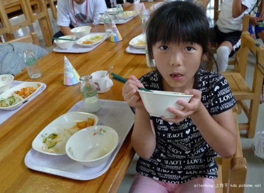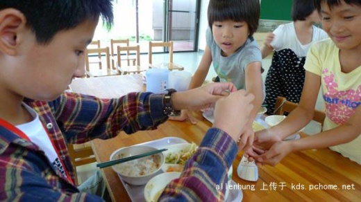 看看日本小朋友吃飯的樣子,很努力的吃,湯已經一滴不剩了,菜也快吃完了。