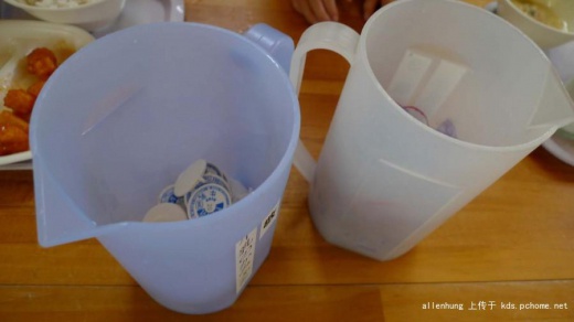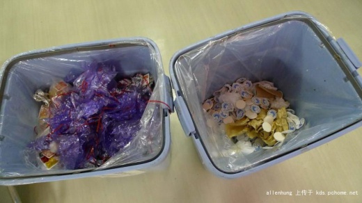 原來,塑膠的包裝要放在左邊的垃圾桶,右面的紙質封蓋要在右面。