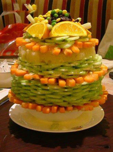 把水果還有沙拉食材疊的跟一座小塔一樣,