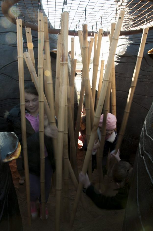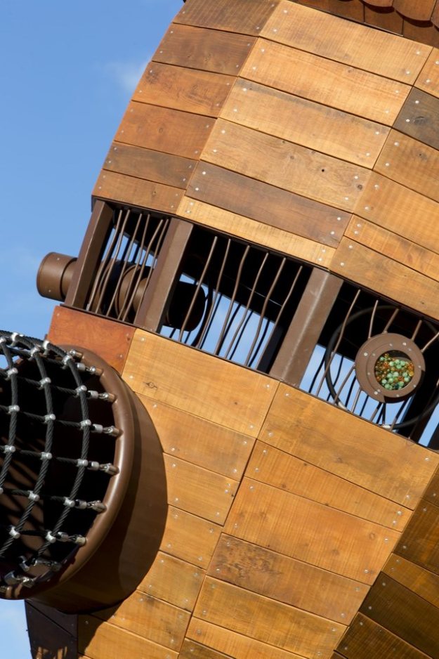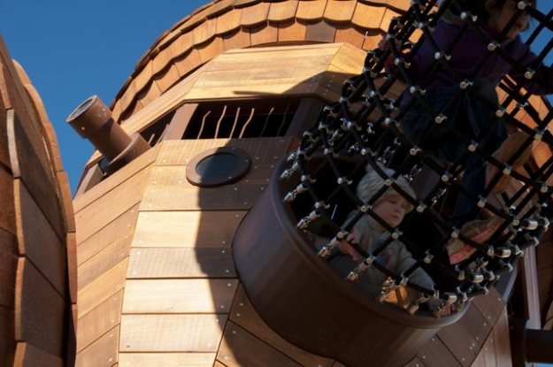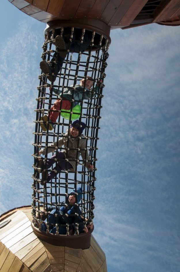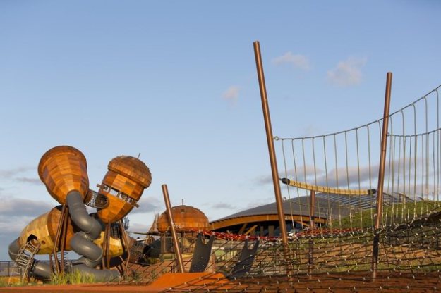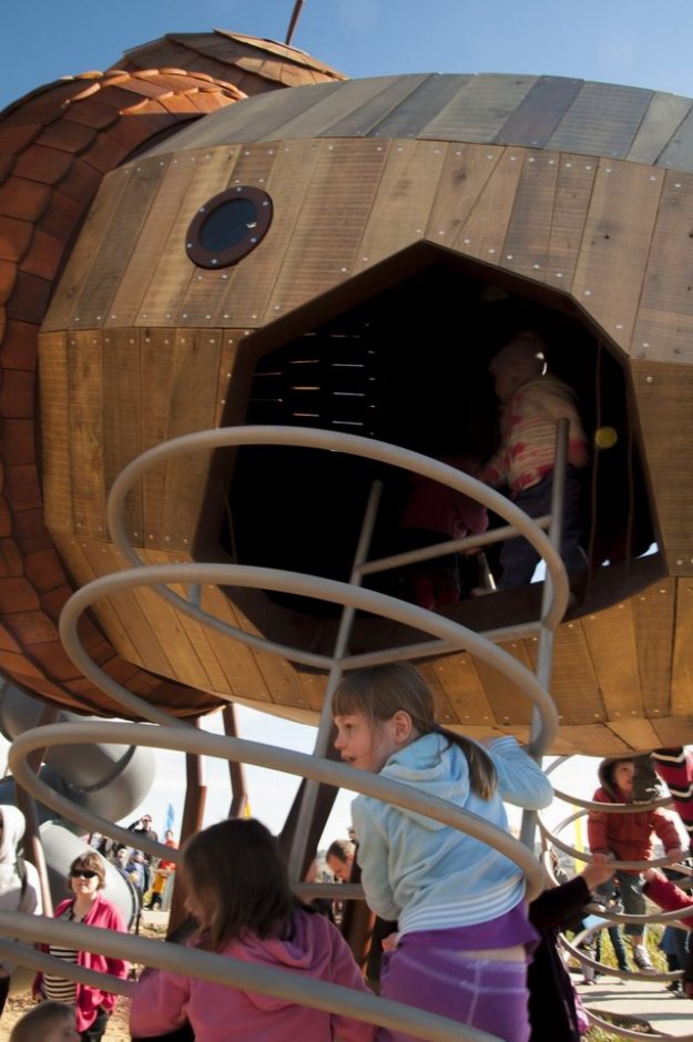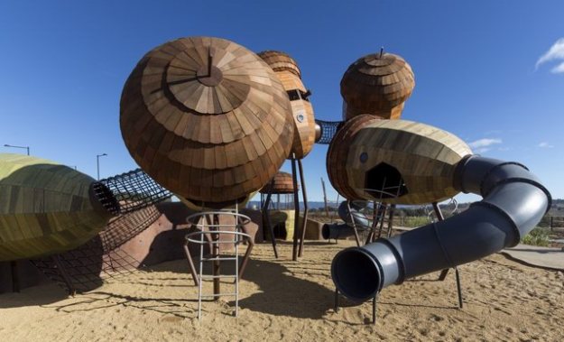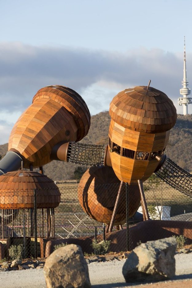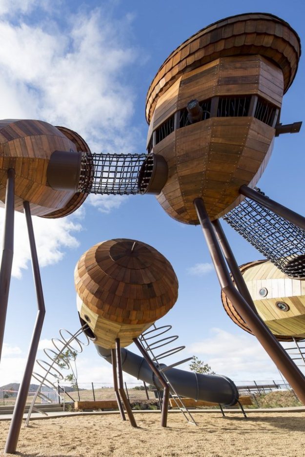Taylor Cullity Lethlean將游樂場設計成了一個小型的主題公園,主題當然是圍繞著植物進行。你可以看到巨大的橡子小屋被掛在天空,「 橡子 」之間有管道連接,孩子們可以從這顆「 橡子 」爬進那顆「 橡子 」。還有巨大的山龍眼(Banksia,澳洲著名的代表性植物之一)圓錐體坐落在森林地表。
