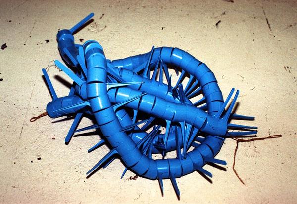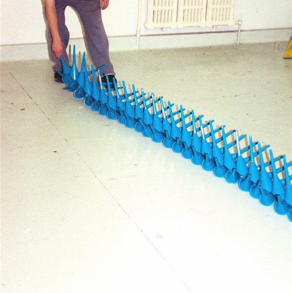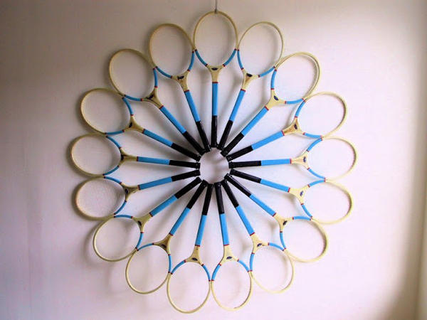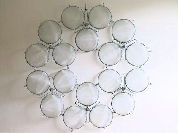 選擇日常生活物件當材料,透過大量且重複排列的方式來改變原本的型態,組裝的過程並不複雜,重點在於能不能看出這些物品潛在的可塑性,「人們習慣於各種複雜的東西,而這個系列創作的重點在於將元素單一化,以規律重複的排列方式來創造完全不同的新物件」,除了衣架之外,Edmond van der Bijl 也找來網球拍、曬衣夾、鞋扒、漏斗等家庭用品,這些東西的數量之多,幾乎可以掏空一家五金行的所有庫存,光想就覺得很有趣~~
