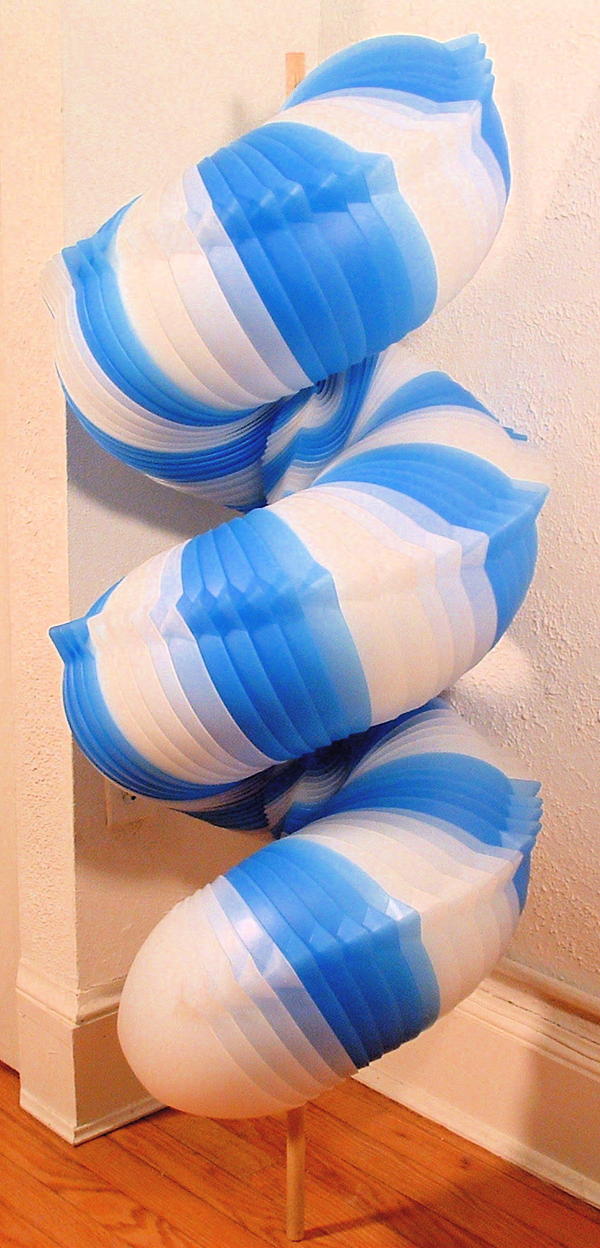 選擇以數量來決勝負,用大量重複的單品營造出完全不同的形象,仔細看上圖的藍色星星雕塑,恬靜的藍色和多角星星相當具有節慶氣氛,但其實它是由一堆超普通的塑膠三角衣架組成的,想不到它的真面目這麼居家,看得我好想也在家組一個阿!