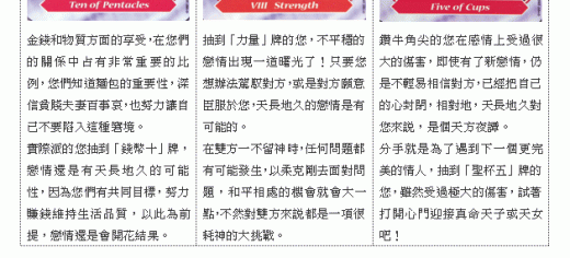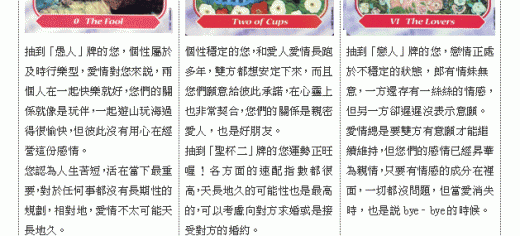 下一秒會發生什麼事總是無法預料,才需要特別了解。快來專注精神吧!在心中默想:「我和愛人最近會有什麼問題?」然後,用左手從下面六張牌中抽出一張,再對應到牌面的解釋,就可以清楚解讀出,宇宙中所存在的能量訊息了。