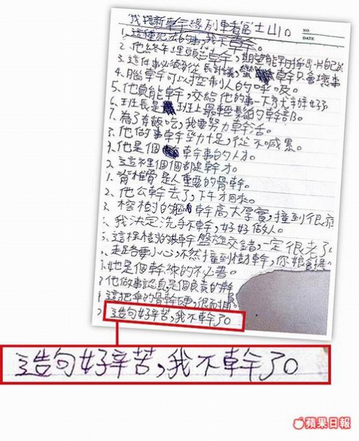 不幹了」等。造句內容被老師轉貼在網上暴紅,網友甚至還留言:「幹的好!」