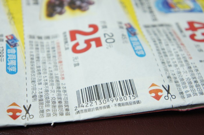 放大一點看仔細,看到沒有,整張DM裡隱藏某些商品的折價券是:「請直接刷折價券條碼,不需刷商品條碼」。