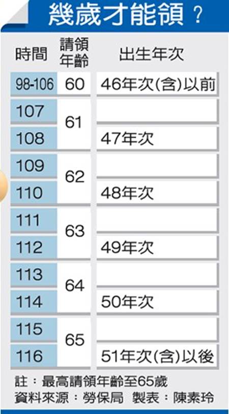 目前勞保年金請領年齡是60歲,但107年起,法定請領年齡每兩年提高1歲,很多民眾不清楚。勞保局表示,民國46(含)年次以前出生的民眾,請領年金的年齡都是60歲,但47年次出生的勞工,因為61歲才能領勞保年金,故108年起才能請領勞保年金;若要提前領減額年金,最快也是民國103年滿56歲時才可請領。