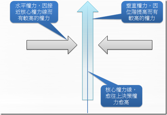 權力的大小一般分成兩大類:即垂直權力與水平權力,若我們將公司中做決策的人當成權力核心,愈靠近這個核心的人對於決策的影響性愈大,垂直權力大多與位階有關,位階愈高通常有愈高的權力;而水平權力呢?通常指的是因為關係、技能、工作特性等,而與權力核心成員有較接近的關係而提高了本身的權力。