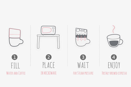台灣已經有不少人愛喝義式濃縮了,而歐洲人對 Espresso 的依賴絕對比我們來得高,但是義式咖啡的煮法有先天的條件限制,對一般人來說並不是那麼方便。來自德國的 Christoph Meyl 便想出一款設計,利用微波爐產生的能量來煮單杯 Espresso,這對於辦公族來說絕對方便快速(尤其是大公司),30 秒就有一杯新鮮的義式咖啡可以喝,比去樓下咖啡店排隊來得快!