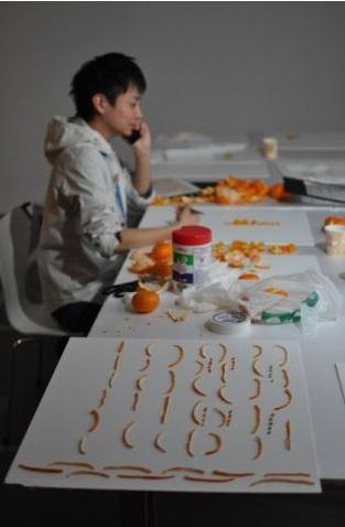 這個創意廣告,除了右上角的漢字是給人看的,其他地方是橘子皮、橘子肉、橘子汁…等橘子的「零件」所佔滿。