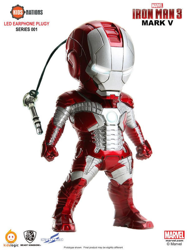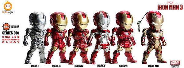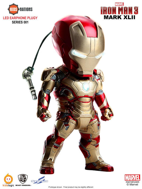 款鋼鐵人耳機塞高度約9公分,胸前的方舟反應爐和眼睛都會透過LED發光,光這個特點都吸引人把口袋小朋友都拿出來了!鋼鐵人版本共六樣,包括馬克42、