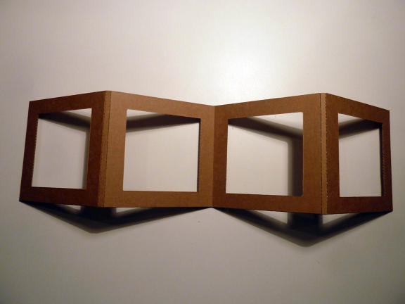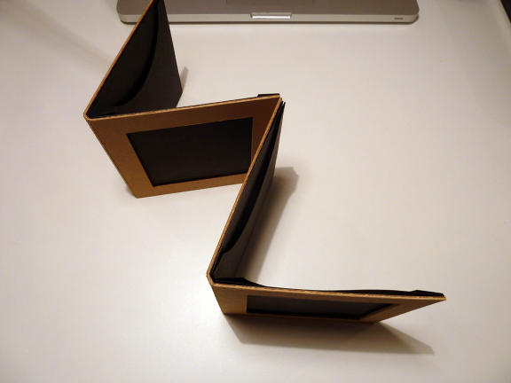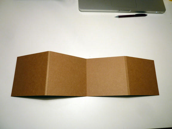 根據四片 CD 的長寬,我將刨花板裁剪成 52.2*12.8〈公分〉的矩形, 並且留下摺線以便折疊。每一片 CD 的長度是 12.8 公分,然後將裁好的刨花板像手風琴一樣摺疊起來,使內層與外層都有摺線。〈我覺得照片比我的說明更好懂〉