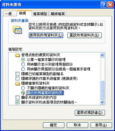 5、無論如何都無法顯示隱藏檔,即使進入「我的電腦\工具\資料夾選項\檢視」中,取消勾選「隱藏已知檔案類型的副檔名」、「隱藏保護的作業系統檔案(建議使用)」,並勾選「顯示所有檔案和資料夾」,待設定完成後再次進入,會發現剛才的設定全都跑掉。