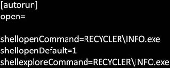 c:\autorun.inf」以顯示該檔案內容,或乾脆直接雙擊開啟之,若出現下圖所示的內容,抑或內容中含有其他.exe、.com、.bat等執行檔,即表示已中毒。不過,Type指令無法顯示使用者自建autorun.inf資料夾的內容,而只會顯示autorun.inf檔案的內容。