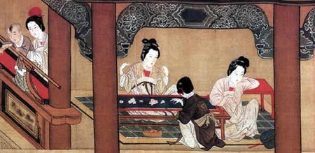 李思訓的《九成宮紈扇圖》、《宮苑圖》等,也是很高成就的,到晚唐出了尹繼昭,五代有衛賢趙德義,趙忠義等人,宋初有郭忠恕,元代有王振鵬,李容槿,明代有仇英,清代有袁江,袁耀等。