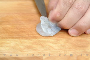 利用牙籤在鮮蝦從頭部算起第二節處插入,輕輕將蝦腸泥挑除。牙籤插入點很重要,如遇前或過後較不容易將腸泥完全挑起,容易挑斷。而且要在腸泥正下方穿過挑起,如穿入過於下面容易將蝦肉弄斷。