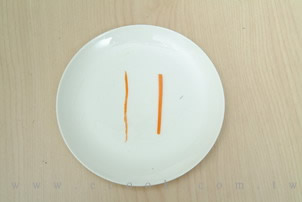 左方為用刨絲器,刨成的絲,右方為用刀切出的絲,兩者不同處為長度、及切割邊緣。