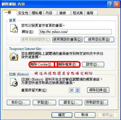 IE6的使用者 在個人電腦網路瀏覽器(Internet Explorer)點選右鍵--->內容即可,此時是『一般』選項--->按﹝刪除Cookie(I)... ﹞跟﹝刪除檔案(F)...﹞ 這兩項點選刪除後,這樣就能盡量必免帳號被盜用或木馬之類的為害。