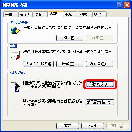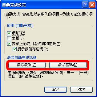 IE6的使用者除了刪除Cookies和暫存資料檔之外,這個功能『自動完成』選項也要記得一並刪除,因為曾經輸入過的表單和密碼在刪除前都還會一直存在。 內容--->按﹝自動完成(U)... ﹞--->按﹝清除表單(C)...﹞跟﹝清除密碼(L)... ﹞
