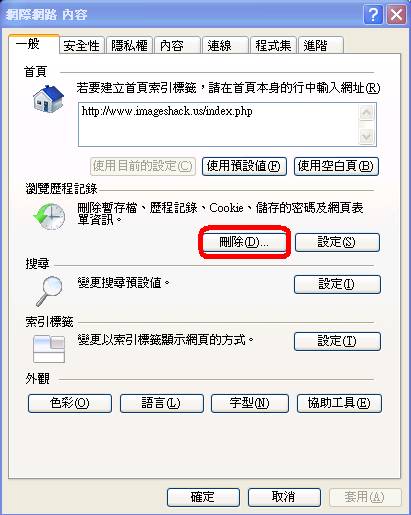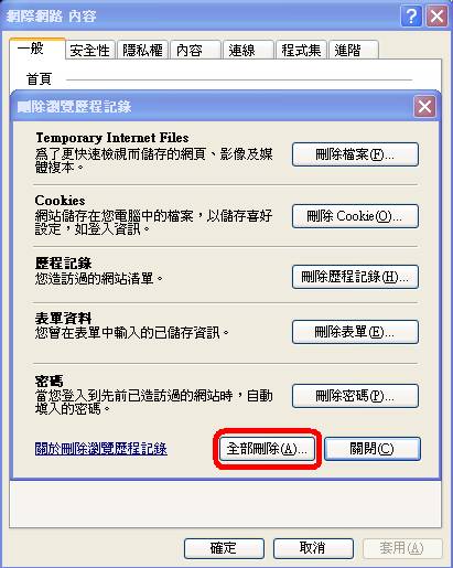 IE7的使用者就方便多了,只要按照下面的方法就能全部刪除。 在個人電腦網路瀏覽器(Internet Explorer)點選右鍵--->內容即可,此時是『一般』選項--->按﹝刪除(D)...﹞--->按﹝全部刪除(A)...﹞