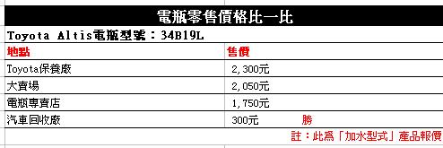 「汽車回收廠」中也有便宜可以撿,有許多舊車上的電瓶都是新的!使用上絕對沒問題,每顆只賣300元,只要規格符合,買到就像撿到一樣高興。Toyota原廠報價2,300元(加水式),這是「帶出場」的價格,安裝工資另計。其次是大賣場的2,050元,同樣是得自己安裝。接下來是「電瓶專賣店」的1,750元,這種行業其實相當普遍,在橋頭、交通要道常常可以發現。至此,價格差異已經高達550元,最勁爆的來了,「汽車回收廠」一顆300元!鐺、鐺 ,比「歐兜拜」的電瓶還便宜是怎麼回事?