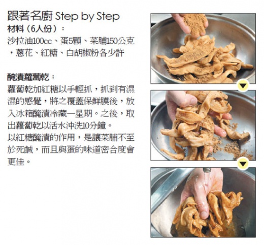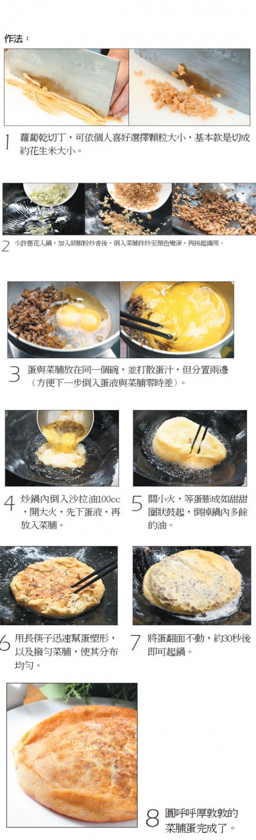1.許多師傅煎菜脯蛋時會一直旋轉鍋子,其實並不需要,主要的關鍵時刻在放入蛋的時間點,蛋會在鍋內整個擴散,只要用筷子快速收邊、把菜脯分布均勻即可。