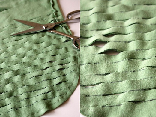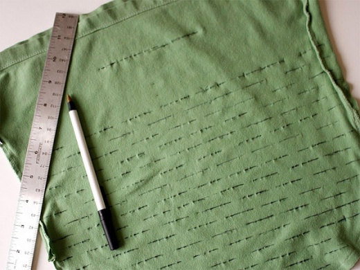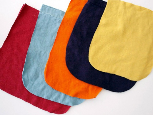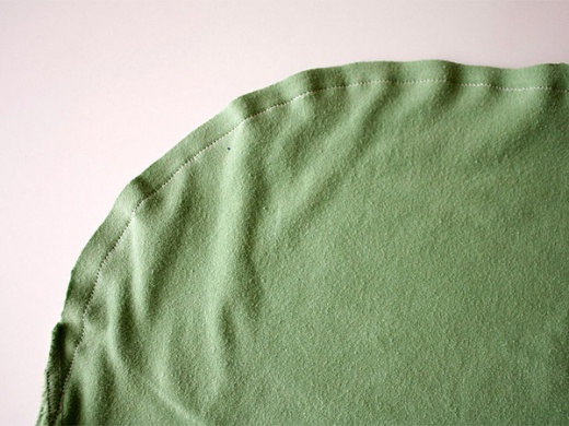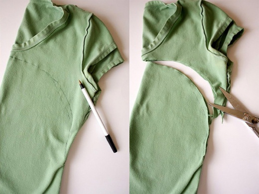 (上圖)將舊T-shirt對折,用簽字筆在上面畫一個1/4圓,再用剪刀剪開